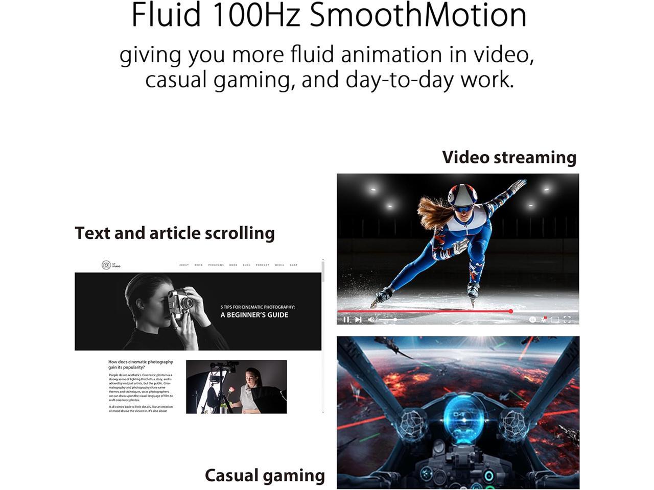 - SmoothMotion 100Hz refresh rate and 1ms MPRT delivers a seamless, tear-free visual experience by enabling VRR (variable refresh rate)