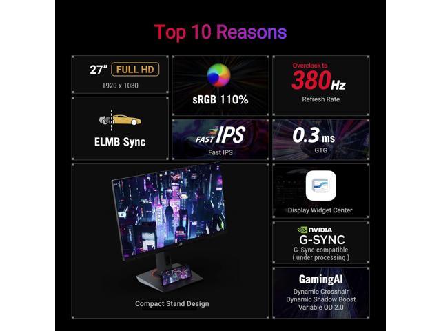 - 27-inch Full HD (1920x1080) HDR gaming monitor with overclock to ultrafast 380Hz refresh rate designed for professional gamers and immersive gameplay