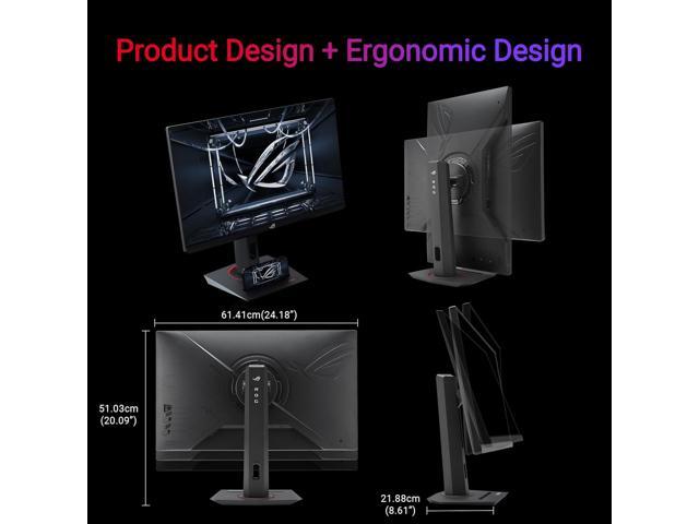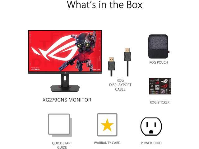 - What's in the Box: DisplayPort cable, ROG pouch, ROG sticker, Power cord, Quick release stand, Quick start guide, Warranty Card