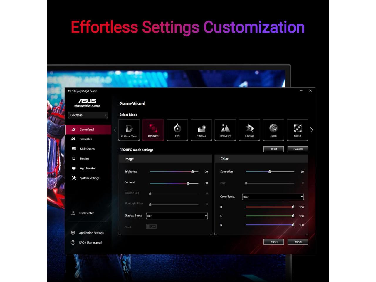 - Exclusive ASUS DisplayWidget Center application enables easy OSD access and monitor settings adjustments with a mouse.