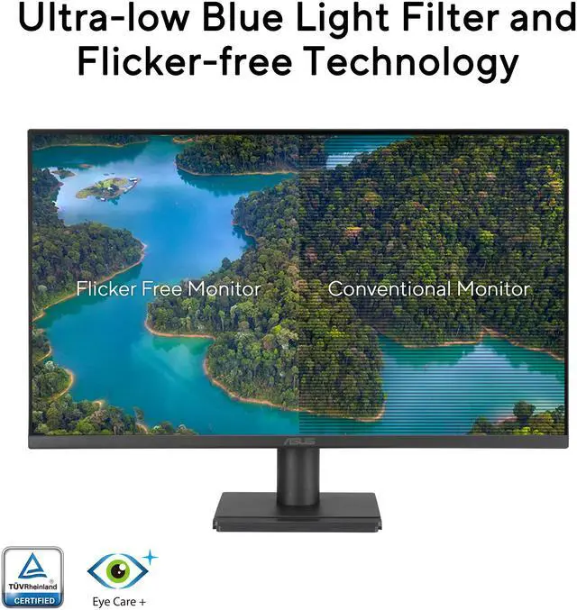 It also has pass-through port for the headphone jack input. ASUS DisplayWidget CenterASUS DisplayWidget Center is an app that allows you to tweak monitor settings with a mouse instead of using the buttons on the monitor. Protect your eyes with ASUS Eye Care technologyASUS blue light filterFor viewing comfort and for protection from potentially harmful blue light, it offers intuitive and flexible with seamless adjustment that are easily accessed through the onscreen display menu. ASUS Flicker-free technologyIt's time to say goodbye to those tired, strained eyes. Flicker-Free technology helps reduce onscreen flicker, giving you a more comfortable, movie-marathon-ready environment.