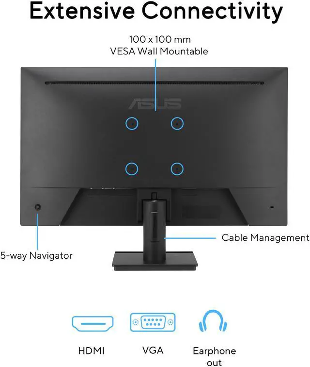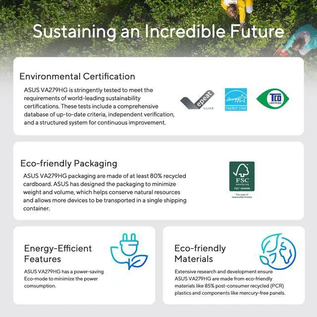 It is designed to minimize eyestrain, headaches and eye fatigue when you spend long, countless hours in front of the display. Sustaining an Incredible FutureEnvironmental CertificationASUS VA279HG is stringently tested to meet the requirements of world-leading sustainability certifications. These tests include a comprehensive database of up-to-date criteria, independent verification, and a structured system for continuous improvement. Eco-friendly MaterialsExtensive research and development ensure ASUS VA279HG is made from eco-friendly materials like 85% post-consumer recycled (PCR) plastics and components like mercury-free panels.