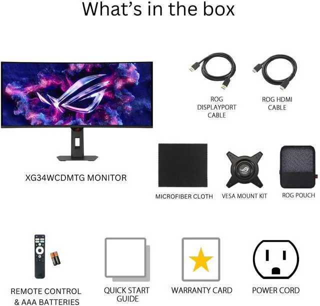 • What's in the box: DisplayPort cable, HDMI cable, USB-C cable, Power cord, Remote Controller, AAA Battery x2