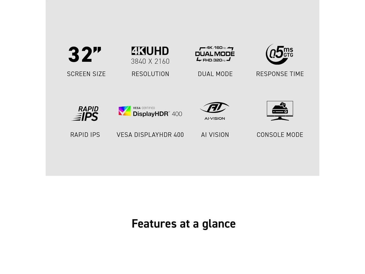 MSI MAG 322URDF E16 Gaming Computer Monitor 32" 3840x2160(4K) 160Hz UHD / 320Hz FHD Rapid IPS FreeSync (AMD Adaptive Sync) 0.5ms DisplayHDR 400 Eye Protection AI Vision Dual-Mode