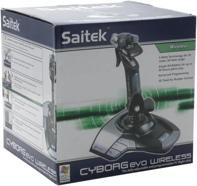 | Specifications | Rapid-fire trigger 5 fire buttons 8-way ‘point-of-view’ hat switch 3D twist for rudder control 2 X 8-way Hat Switches 3D rudder twist 2 shift buttons 4 base buttons Single spring gimbal mechanism 3 position handle adjustment to suit all hand sizes 2.4GHz RF Wireless solution delivers up to 30 feet (ten metre) range Up to 50 hours of play on a single alkaline battery |