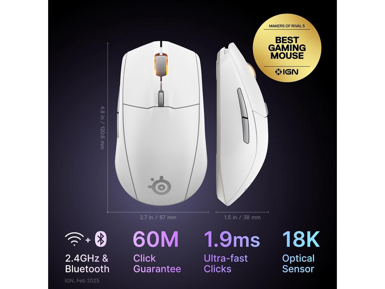 SteelSeries Rival 3 Wireless Gen 2 Gaming Mouse — 2.4GHz and Bluetooth, 18000 DPI TrueMove Air Optical Sensor, 60 Million Click Durability, Light-Weight, 100% PTFE Feet — White