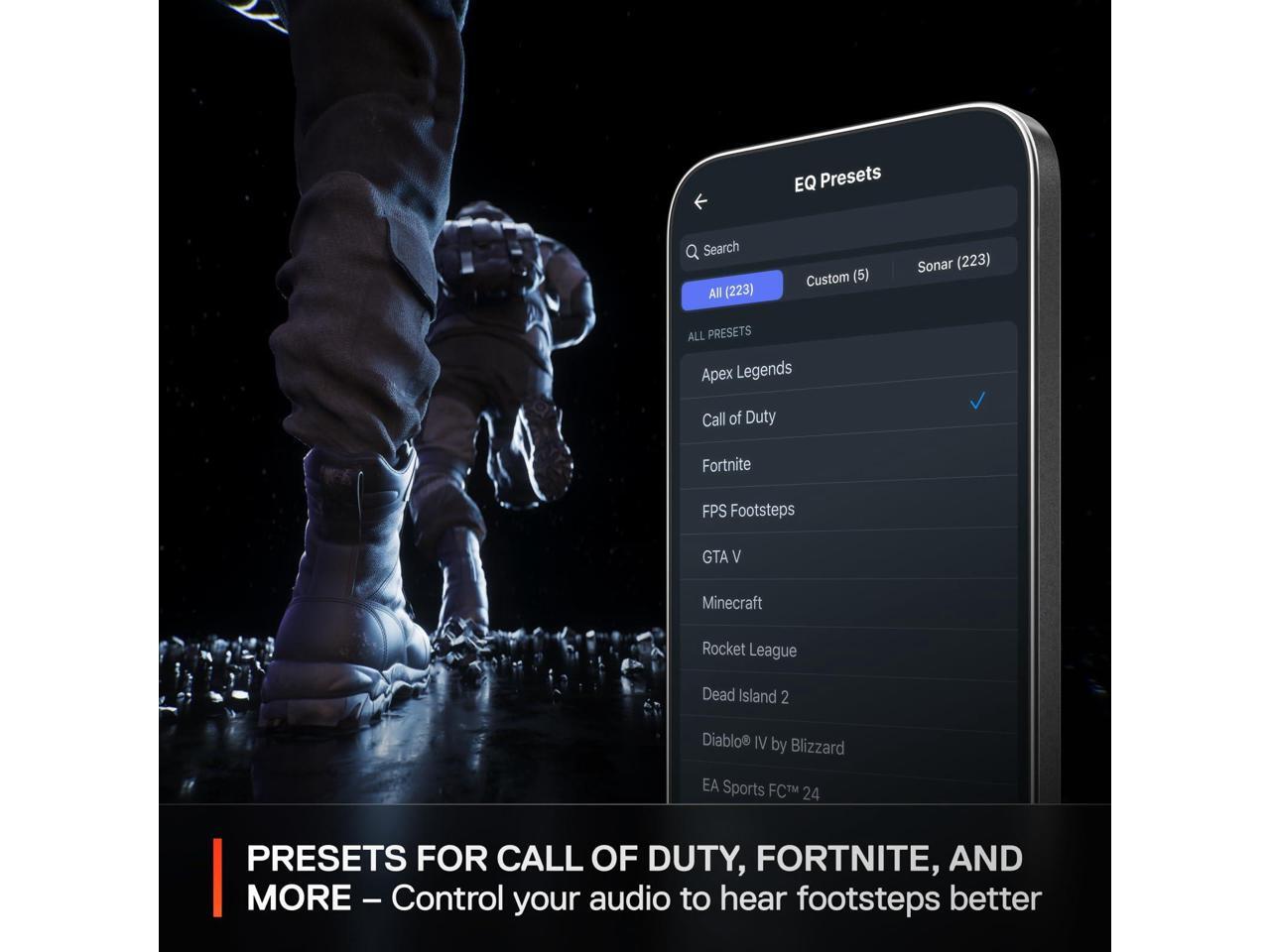 - PRESETS FOR CoD, FORTNITE, AND MORE – Control your audio using the mobile app to hear footsteps better in game. Unlock total audio control with 200+ game presets in the Arctis Companion.