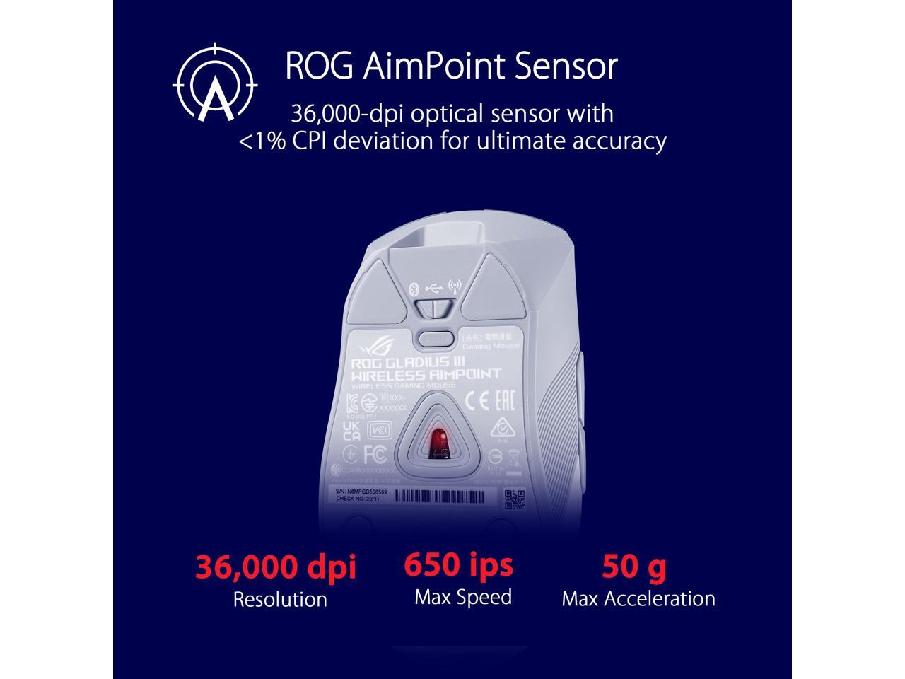 Asus ROG Gladius III Wireless AimPoint Gaming Mouse, Connectivity (2.4GHz RF, Bluetooth, Wired), 36000 DPI sensor, 6 programmable buttons, ROG SpeedNova, Replaceable switches, Paracord cable, White
