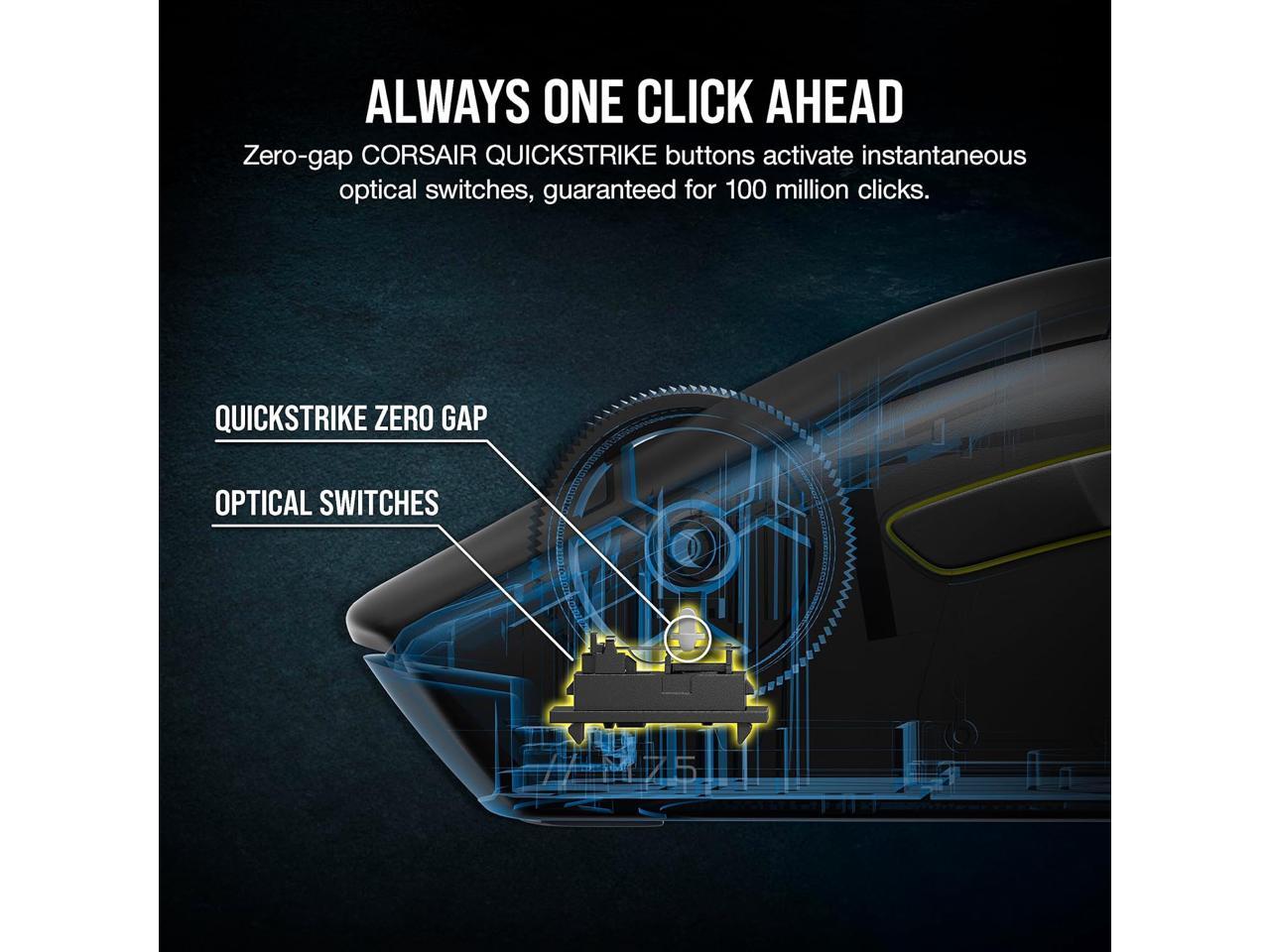 CORSAIR QUICKSTRIKE BUTTONS: CORSAIR QUICKSTRIKE delivers zero delay between the left and right click buttons and their switches, so your shots register instantly.