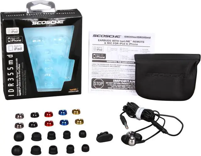 | Features | Adjust volume by pressing the + and – buttons Control music and video playback; including play/pause and next/previous by pressing the center button Integrated microphone for handsfree conversations, voice command and recording voice memos on supported iPod and iPhone models Navigate playlists and activate the VoiceOver feature on the iPod shuffle 3rd generation 6 sets of interchangeable color caps allow you to customize the appearance of the earphones. Includes gold, dark blue, black, dark red, chrome and black chrome S/M/L single and dual flanged silicone inserts provide unparalleled noise isolation and comfort Includes travel pouch |