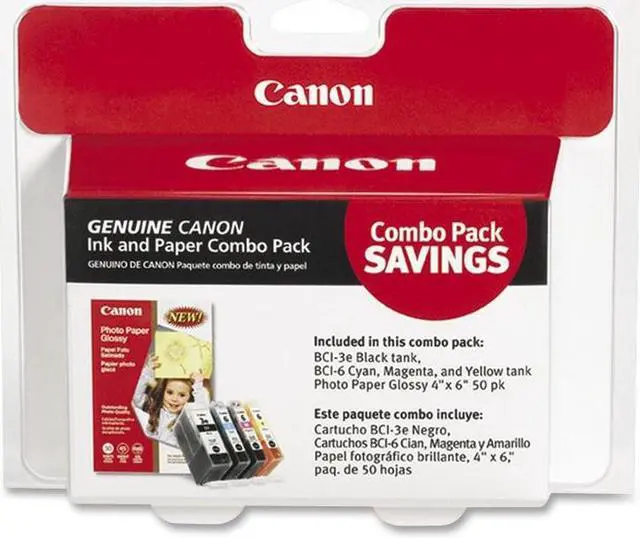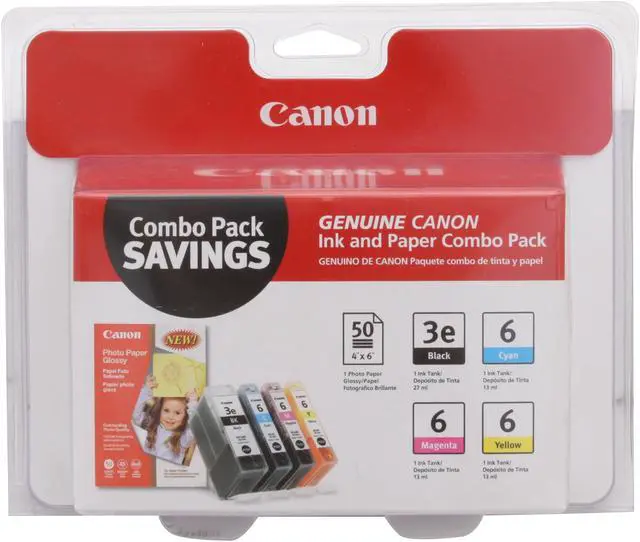 Ink and photo paper combo pack contains one each of BCI-3e Black, BCI-6 Cyan, BCI-6 Magenta, BCI-6 Yellow, and one 50-sheet pack Photo Paper Glossy 4" x 6". Designed for use with Canon i560, i860, Pixma iP3000, Pixma iP4000, Pixma iP4000R, Pixma iP5000, Pixma MP750, Pixma MP760 and Pixma MP780 Photo All-In-One.