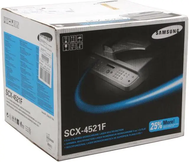 The Samsung SCX-4521F features six built-in copying modes that provide ample versatility of printing such as Auto Fit, Collation, Clone, Poster, ID Card, etc. The fax offers 2 MB of built-in memory to store up to 160 pages of letter-sized documents while the auto dialer memory can store up to 100 entries. Fax messages are sent with 3-second scan and 3-second transmission speeds (33.6 Kbps) directly from the computer. It even allows scanning documents and converts them to text files automatically with the OCR function built into its scanner. It can scan up to 600 x 600 dpi for reproducing sharp scans from complex color documents and even 3-D objects.