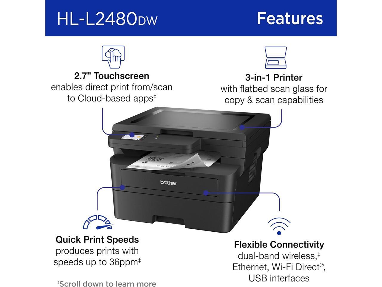 Brother HL-L2480DW Wireless Compact Monochrome Multi-Function Laser Printer with Copy and Scan, Duplex, Mobile, Black & White