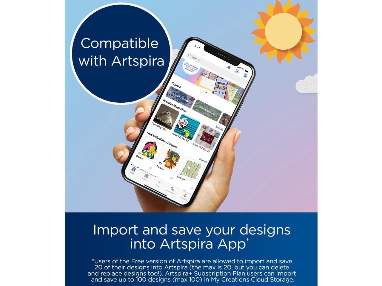 Artspira App¹ Draw your next project on the Artspira App¹. With an array of patterns and cut data you can download, plus the ability to make embroidery patterns by drawing on your mobile device, and then transferring them to your PE900 wirelessly, the Artspira App¹ will have you creating on the go.