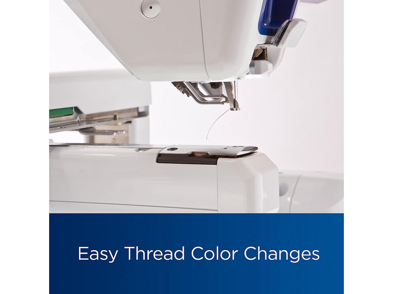 - Vertical bobbin: Anytime access. Now you can easily change your bobbin without having to remove your hoop. This truly is a timesaving convenience.
