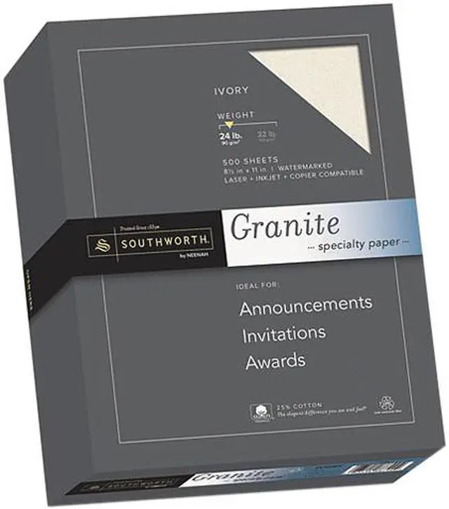Southworth's Granite Paper has the look of polished granite with a smooth and elegant feel. This 25% cotton paper is perfect for presentations, correspondence, C.V.s, letterheads, awards and more! Made from 75% recycled content with 50% consumer materials. Laser, inkjet and copier compatible.