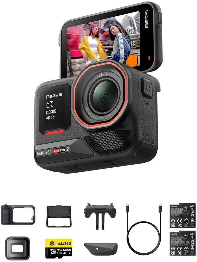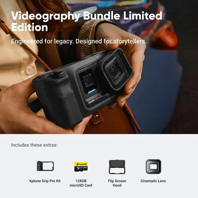 • VIDEOGRAPHY BUNDLE LIMITED EDITION: 1x Insta360 Ace Pro 2, 1x Wind Guard, 2x Batteries, 1x Standard Mount, 1x Mic Cap, 1x USB-C to USB-C Cable, 1x Xplorer Grip Pro Kit, 1x Flip Screen Hood.