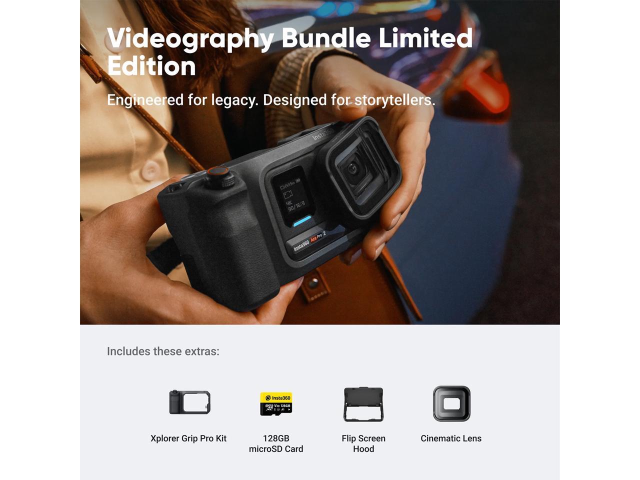 - VIDEOGRAPHY BUNDLE LIMITED EDITION: 1x Insta360 Ace Pro 2, 1x Wind Guard, 2x Batteries, 1x Standard Mount, 1x Mic Cap, 1x USB-C to USB-C Cable, 1x Xplorer Grip Pro Kit, 1x Flip Screen Hood.