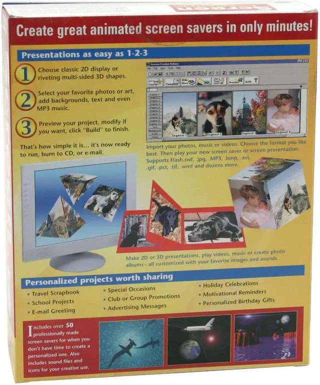 | Feature | Create impressive, animated screen savers in minutes using your digital photos, images, and audio files. Screen Creator Deluxe requires no artistic ability or additional graphic tools - your presentation is assembled for you automatically. Screen Creator is perfect for showcasing your photos, sounds, and animations. Share vacation photos, capture precious moments, celebrate weddings, remember holiday events or just dazzle your friends. Whether you are presenting memories for your family or organizing a school or club project, creating your own screen saver using your digital camera, music, or scanner has never been easier. |