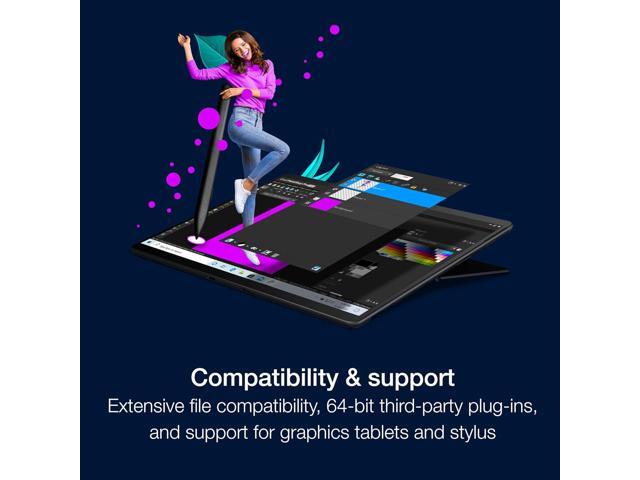 Import/export a variety of file formats, including Adobe PSD, get support for 64-bit third-party plug-ins and graphics tablets, and find learning resources in-product