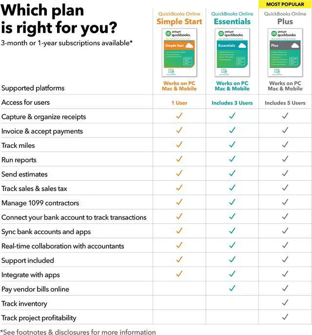 # of Users: Simple Start – 1 user Essentials – Up to 3 users Plus – Up to 5 users