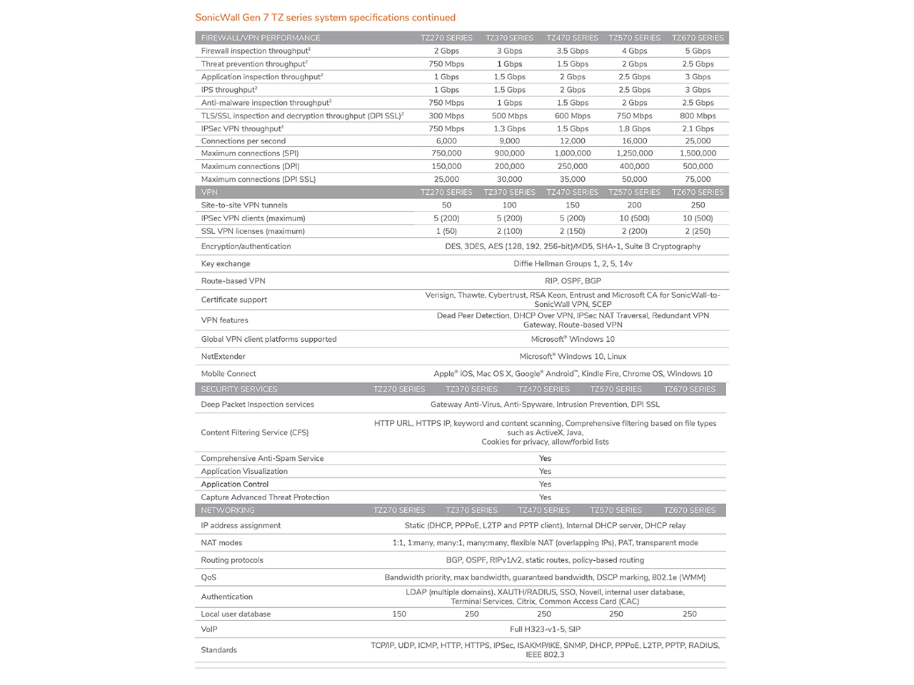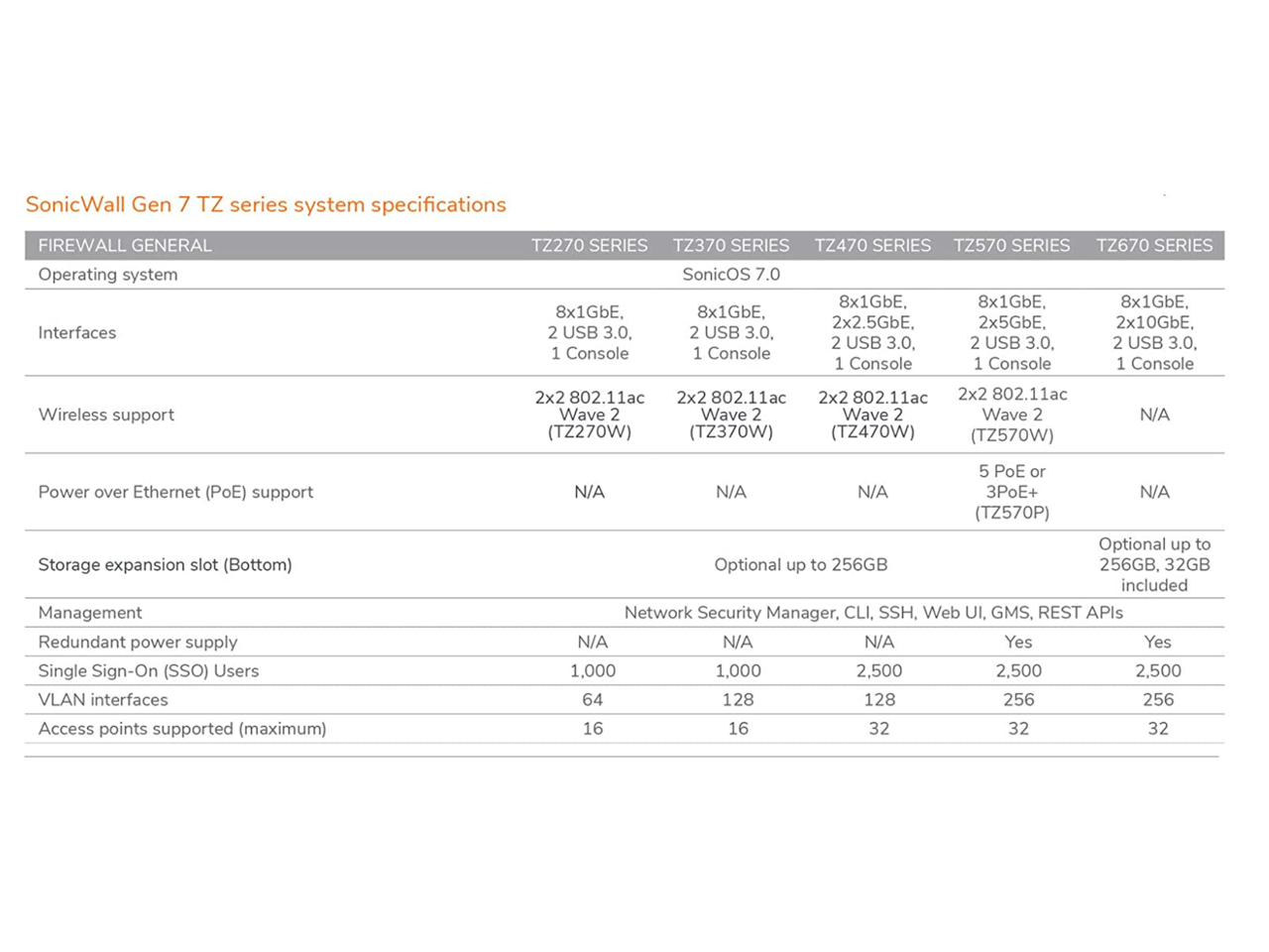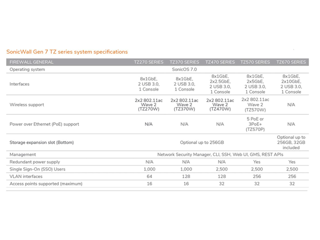 - Hardware: Operating system: SonicOS 7.0 | Interfaces: 8x1GbE, 2x10GbE, 2 USB 3.0, 1 Console | Management: Network Security Manager, CLI, SSH, Web UI, GMS, REST APIs | VLAN interfaces: 128