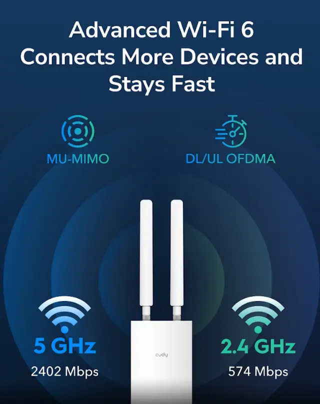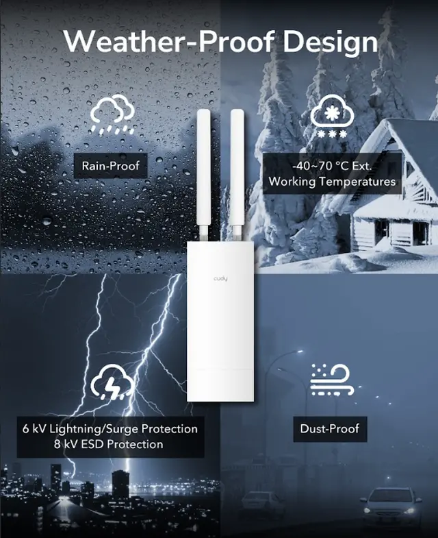 A pole/wall-mounted WiFi 6 AP featuring eFEM providing exceptional range performance. The IP65 casing, PoE, and Cudy Mesh features, ideal for high-density park, farm, and parking lot environments.