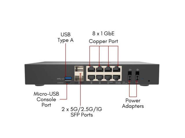 - Interfaces: 8 x 1GbE Cu, 2 x 5G/2.5G/1G SFP, 1 console (Micro-USB), 1 USB (type-C)