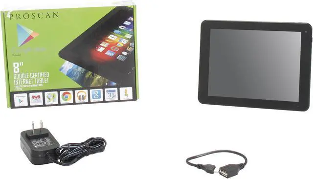 Enjoy an advanced digital lifestyle with the help of the Proscan Internet Tablet Bundle. This black, sleek and stylish tablet comes with the latest Android 4.1 Jelly Bean OS which allows you to enjoy a faster, more intuitive interface, smarter notifications, and an easy home screen customization. Powered by a three-core 1.2GHz processor with 512MB DDR3 memory it performs smooth computing operations. The 4GB storage capacity provides enough space to save your applications, media and other files. You can enjoy vivid visuals and smooth game play on its 8in. touchscreen. Buy the Proscan Internet Tablet Bundle now!