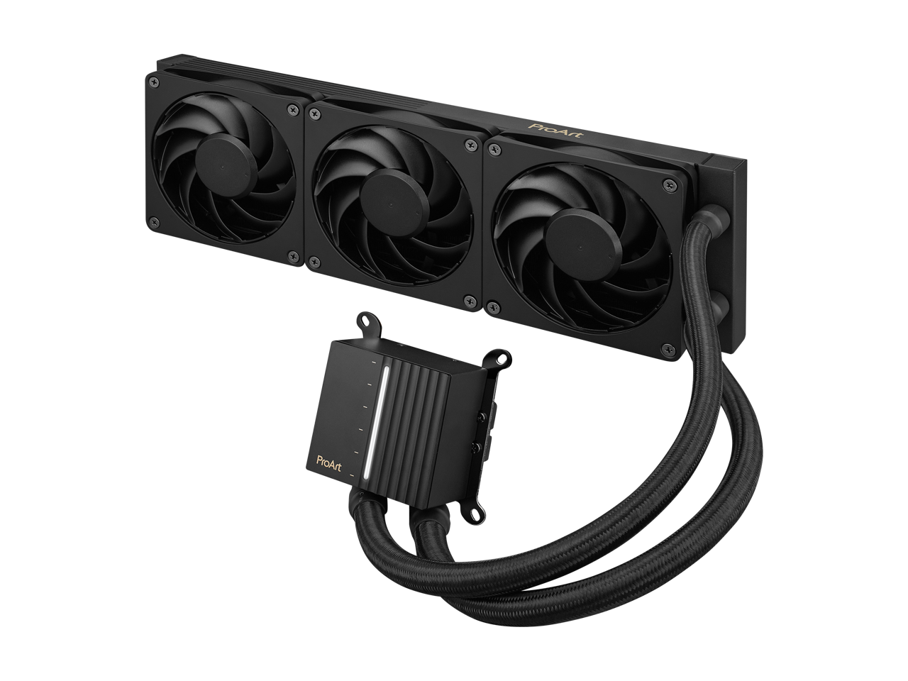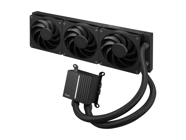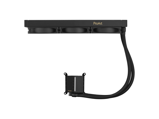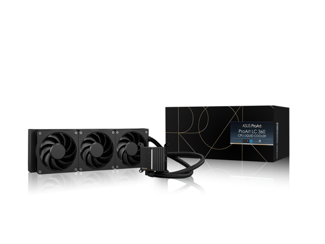 ASUS ProArt LC 360 all-in-one AIO CPU liquid cooler AMD AM4 AM5 & Intel LGA 1700, 1200, 115X support, with illuminated system status meter and three matte black Alphacool Apex Stealth Metal Power fans