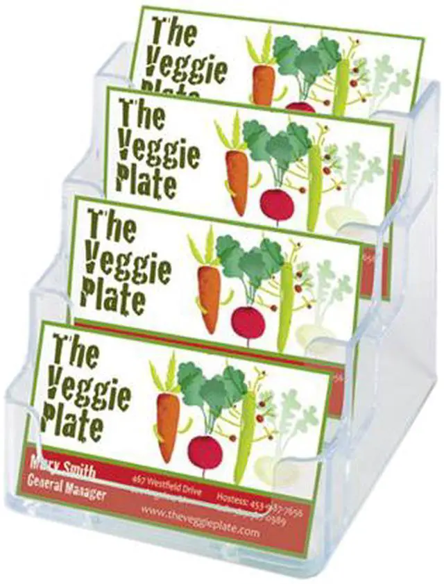 Low-profile business card holder is ideal for doctors' offices, travel agencies and retail outlets. Clear acrylic design provides full visibility. Four pockets are arranged in one row on an incline. Use card holder on counter or desktop.