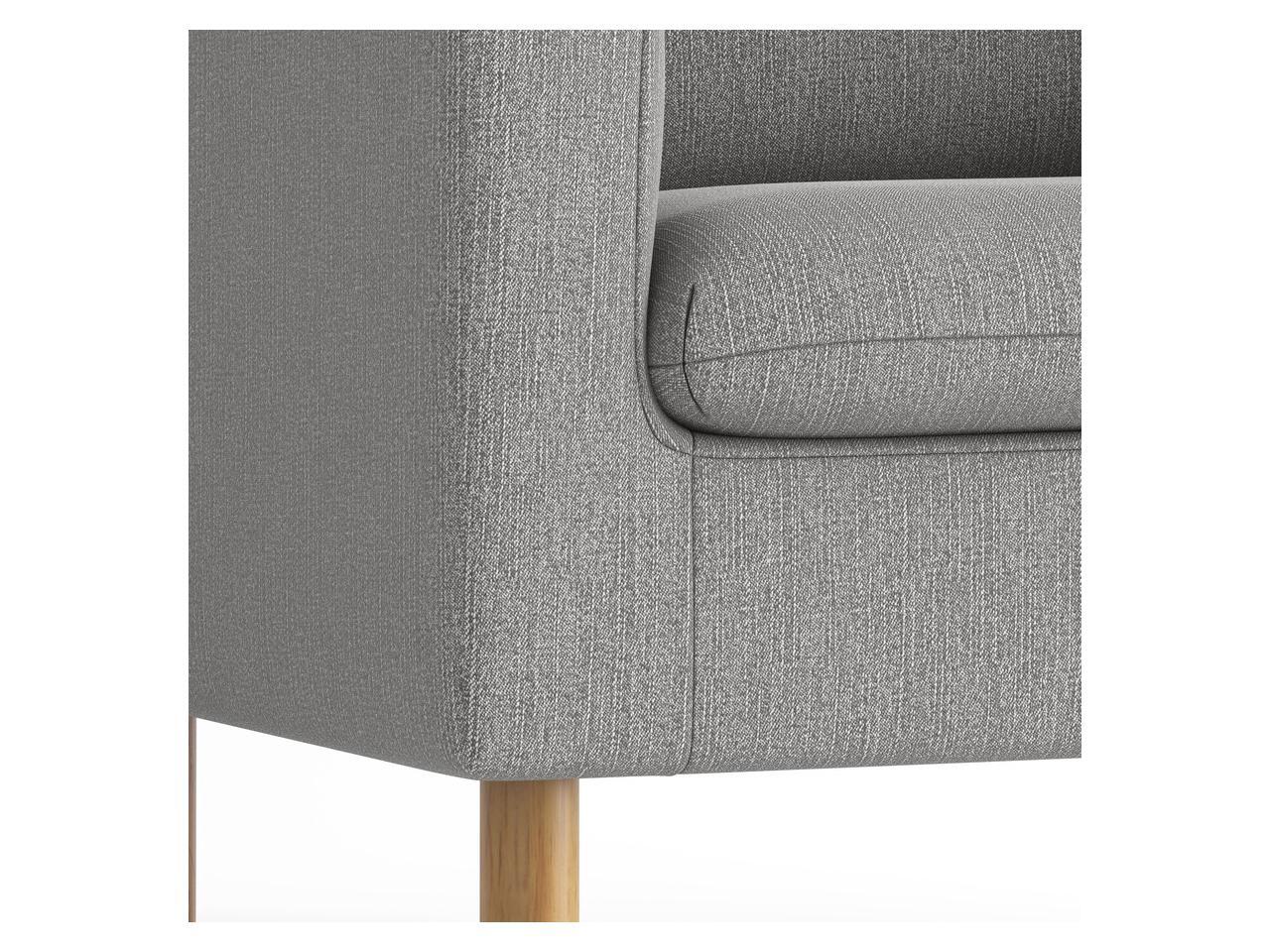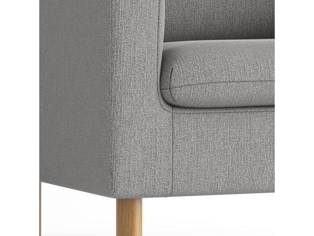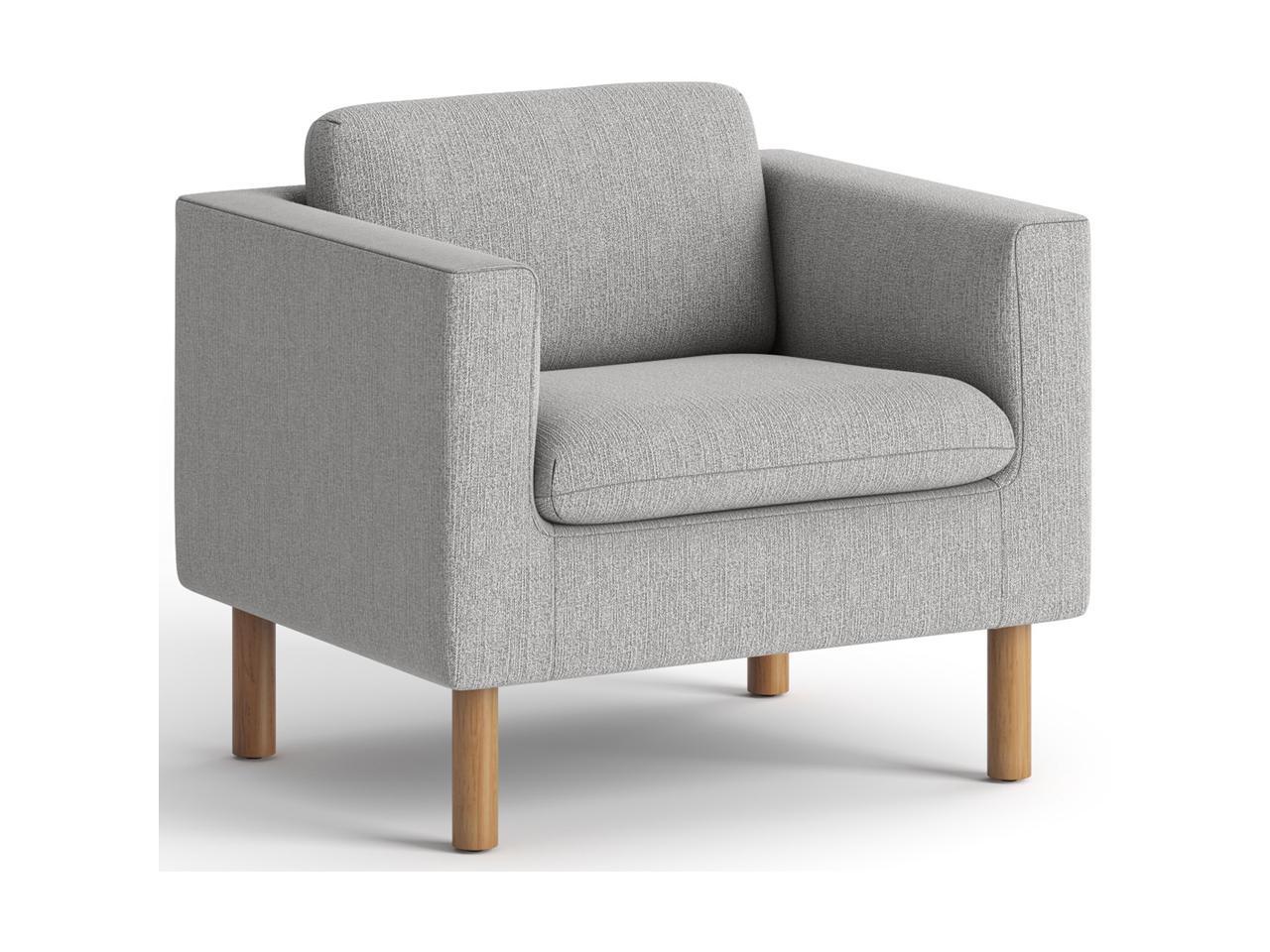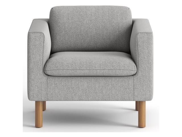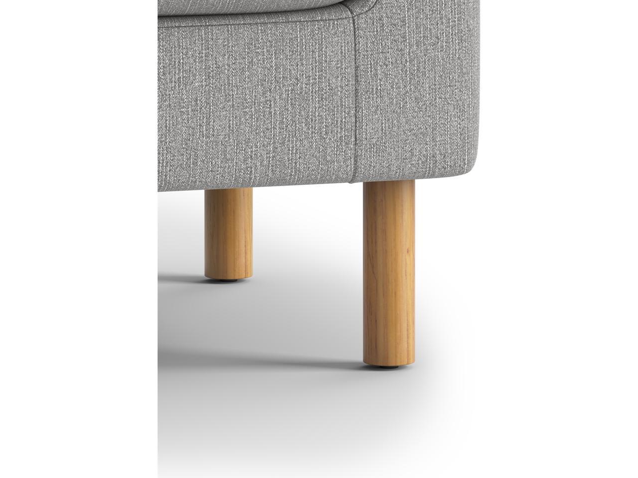 Upholstered in gray fabric for a neutral look and equipped with Medium Oak legs for reliable support