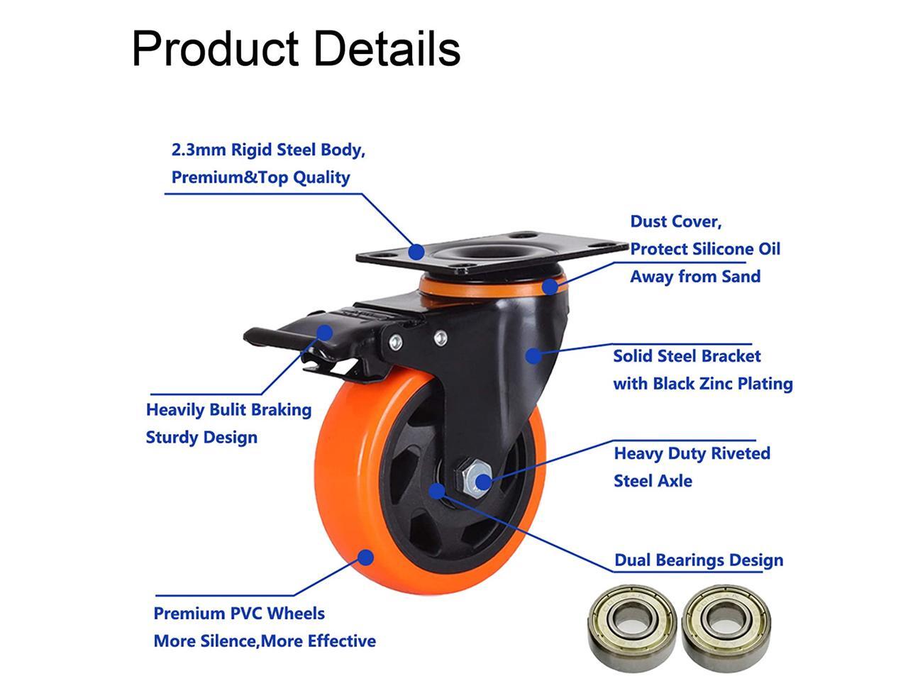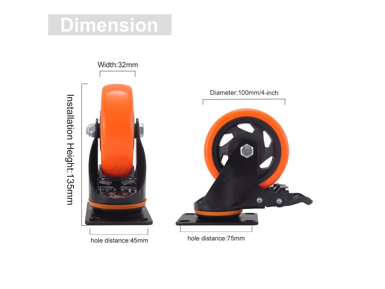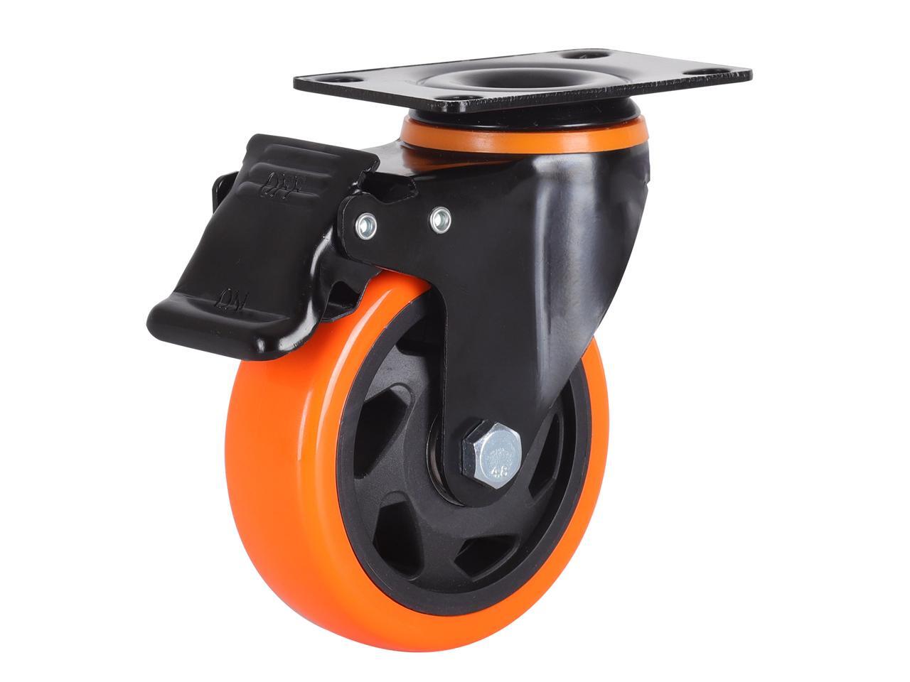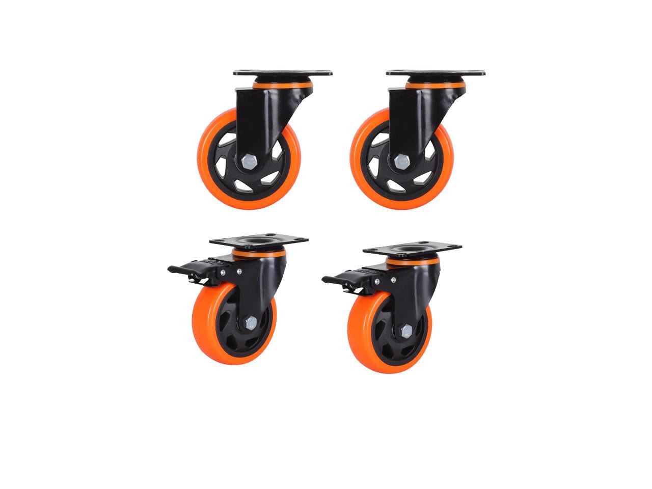 Nippon Labs 4 Inch Swivel Caster Wheels with 2 Brakes + Screws, No Noise Wheels, Heavy Duty - 300 Lbs Per Caster Orange (Pack of 4)