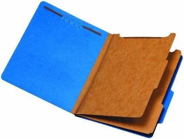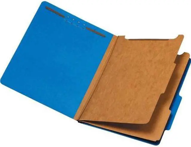 With six filing surfaces, these pressboard classification folders make ideal project files. Inner, 17 point pressboard dividers help subdivide your documents within the folders. 2" embedded fasteners in positions No. 1 and 3 on the covers and 1" dual fasteners on the two dividers keep documents secure and allow you to file in sequential order. Durable, Tyvek tape spine expands 2-1/2" with your project. Standard, 2/5-cut tab right of center with an undercut score on front cover provides room for labels or handwritten titles. Classification folders are made with durable, 25 point pressboard covers and a high percentage of recycled material.