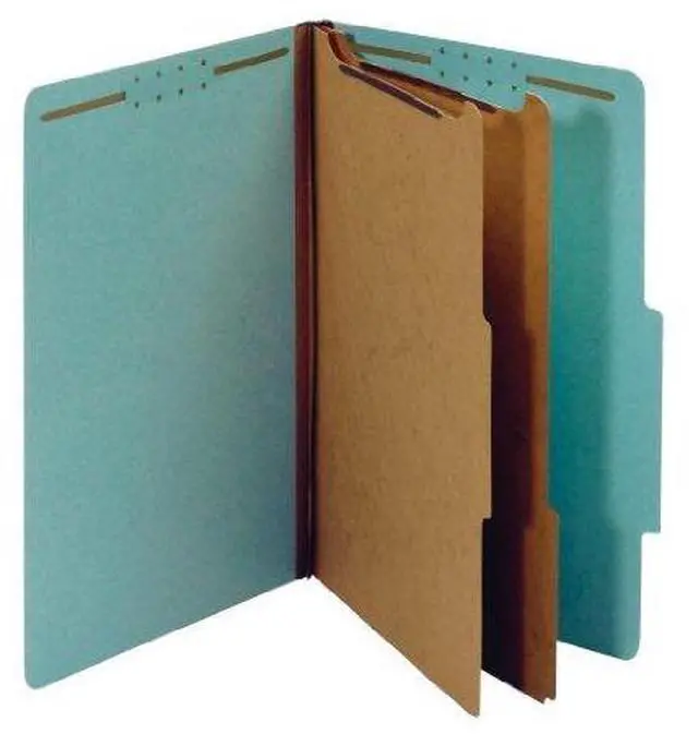 With six filing surfaces, these pressboard classification folders make ideal project files. Inner, 17 point pressboard dividers help subdivide your documents within the folders. 2" embedded fasteners in positions No. 1 and 3 on the covers and 1" dual fasteners on the two dividers keep documents secure and allow you to file in sequential order. Durable, Tyvek tape spine expands 2-1/2" with your project. Standard, 2/5-cut tab right of center with an undercut score on front cover provides room for labels or handwritten titles. Classification folders are made with durable, 25 point pressboard covers and a high percentage of recycled material.