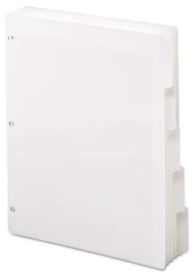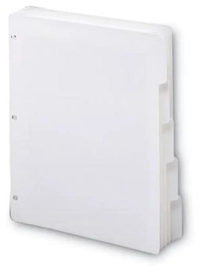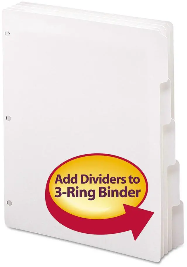 Divide materials into separate classifications inside any three-ring binder with white index dividers. Assorted 1/5 cut tabs allow quick identification of each category. Dividers are slit-punched to accept fasteners so you can keep log sheets or schedules on the dividers.