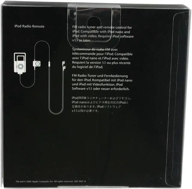 | Features | Listen to FM radio on your iPod and control everything with a convenient wired remote. You also get a set of earphones with a shorter cable that's a perfect fit for the remote. Compatible with iPod nano and iPod The FM Radio Just plug in your iPod Radio Remote and select "Radio" from the main iPod menu. Tuning takes place right there in the color display with your Click Wheel, just as you'd set a classic analog radio. Easily mark a favorite station for quick access later, and switch between favorite stations using either the iPod or the remote. If you're listening to a station that supports the Radio Data System (RDS) standard, you can even see song title/artist or radio station information in the iPod display.The iPod Radio Remote supports FM stations from 87.5 to 107.9MHz (in both the US and European standards) and 76 to 90MHz (the Japanese standard). You can switch between the different standards when traveling. With the wired remote, you can control slideshow, video and music playback — adjust volume, skip forward/back within a playlist -- plus switch between radio stations and turn the radio on or off, even if your iPod is in your pocket or backpack. Clip the remote to your lapel, shirt or collar for easy access, and activate the hold switch to eliminate unwanted button presses. At just over half an ounce in weight (15.7 grams), the compact remote features a simple, familiar interface and plugs into the Dock connection on your iPod or iPod nano. The included pair of Apple Earphones has a cable that's a few inches shorter than a standard earphone cable, making it the perfect fit. You can plug it into the 3.5mm stereo minijack port on the remote, or use another favorite set of earphones. Because the iPod Radio Remote is powered by the iPod itself — no extra batteries required -- using the FM radio will affect iPod playback time. |