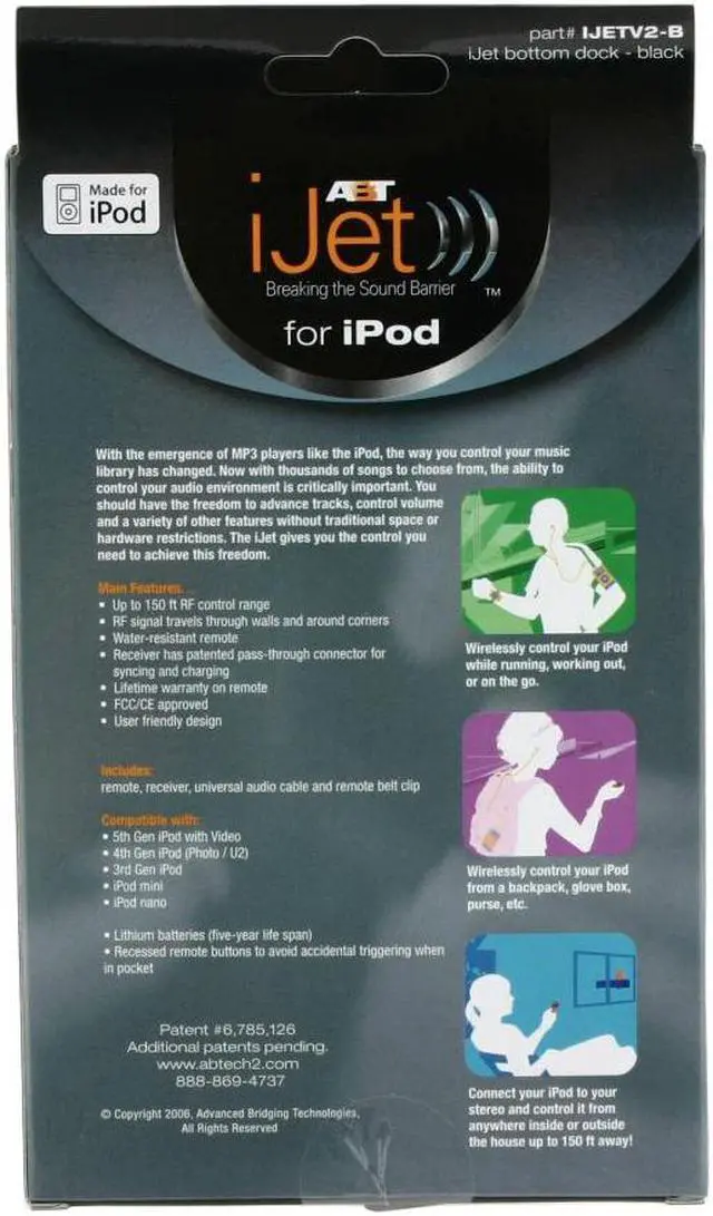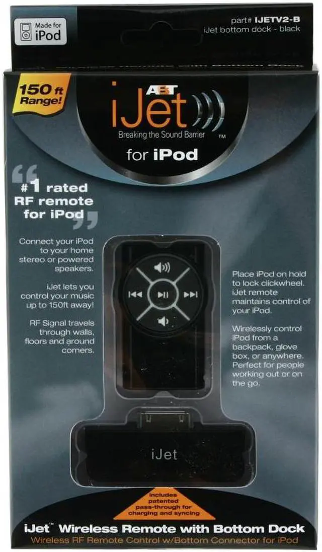 | Features | The new iJet Bottom Dock will support all iPods with dock connectors. You can use this #1 rated wireless RF remote with the Video iPod, iPod nano, iPod photo, iPod mini and 3rd & 4th generation iPods. In addition to its unsurpassed 150-foot range, the new iJet Bottom Dock is the only RF remote on the market that offers a pass-through connector allowing you to connect to other bottom-docking accessories, such as a charger. |