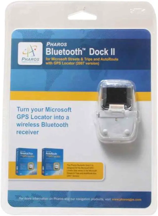 The Pharos Bluetooth Dock allows the GPS receiver sold in the Microsoft Streets and Trips with GPS Locator 2007 package to be used as a wireless Bluetooth GPS receiver. Communicate with wireless Bluetooth connectivity to your laptop, Tablet or Pocket PC. With a range of up to 30 feet, the need for connector cables is completely eliminated, allowing you to place the GPS receiver anywhere in your vehicle. With a rechargeable and replaceable Li-Polymer battery, you'll be able to take long trips with each battery lasting up to 7 hours and 15 minutes fully charged. A DC charging adapter is included so that you'll be able to charge the Bluetooth dock while you're on the road. The blue LED indicator will let you know if your dock is powered on or off.