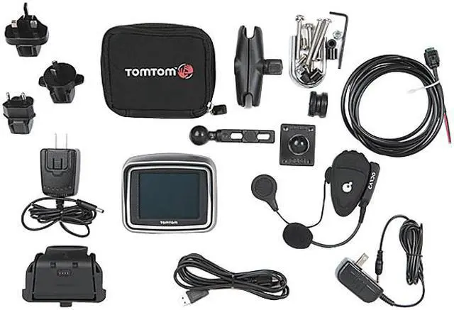 The TomTom Rider is the ultimate in GPS support for your motorcycle! The rugged case is waterproof, and includes heavy-duty RAM mounting hardware that fits most bikes securely. The included Cardo wireless headset gives you clear, spoken directions right in your helmet, so you can concentrate on the road. The graphic interface is clean and simple, so it’s easy to navigate with gloved fingers.
