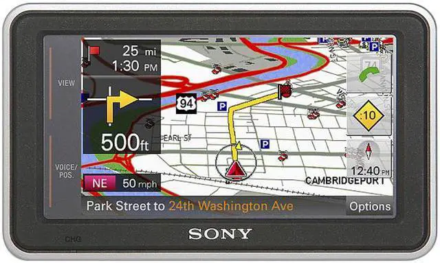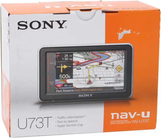 | Audio Features | Traveling to your favorite destinations has never been this easy. The nav-u portable satellite navigation system has a sleek, 4.3" touch-panel widescreen display and can be easily mounted in almost any vehicle. The brilliant, high-contrast full-color graphical interface is also intuitive and fun to use. Whether it's a trip across town or cross-country road trip, the nav-u satellite navigation system makes the perfect travel companion. <b>Dual-View-3D Junction Guide</b> Dual View capability displays dynamic route information, in addition to the conventional map view, to provide an even clearer view of what’s around the bend or in a highway merge scenario, which Junction to take. <b>Gesture Command</b> With a touch-screen comes control via simple, on-screen finger movements. Commonly used commands such as ‘take me home’ may be accessed by gesturing an inverted ‘V’ on the screen versus paging through numerous menu screens. <b>RDS-TMC1 Traffic Messaging Channel</b> Step away from standard GPS mapping and towards a more complete navigation solution. Real Time Traffic Information radio reception allows the NV-U73T to constantly monitor relevant traffic conditions and automatically re-route you around trouble spots! <b>Super Suction Cup Mount</b> Using the Sony-unique Super Suction Cup, mounting a Nav-U portable satellite navigation system to either the dashboard, console, or windshield in virtually any vehicle is quick and easy. Stable and secure while driving, the Nav-U portable satellite navigation system can be easily removed whenever you want to take it with you. |