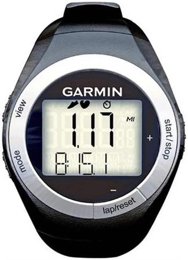 | Specifications | Lap history: 100 laps or up to 7 hours of data Heart rate monitor Bike speed/cadence sensor Foot pod Automatic sync (automatically transfers data to your computer) Garmin Connect compatible (online community where you analyze, categorize and share data) Garmin Training Center software compatible Auto Lap (automatically starts a new lap) Pace alert (triggers alarm if you vary from preset pace) Interval training (set up exercise and rest intervals): alarms only Customizable screen Sport Watch. |