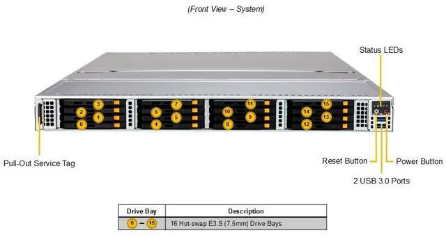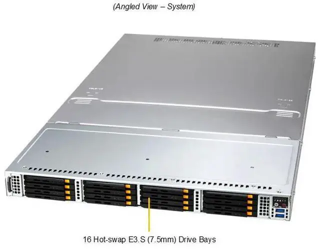 | Expansion Bays | 16 front hot-swap E3.S 1T PCIe 5.0 x4 NVMe drive bays 1 M.2 PCIe 3.0 x2 NVMe slot (M-key 2280/22110) 1 M.2 PCIe 3.0 x4 NVMe slot (M-key 2280/22110) |