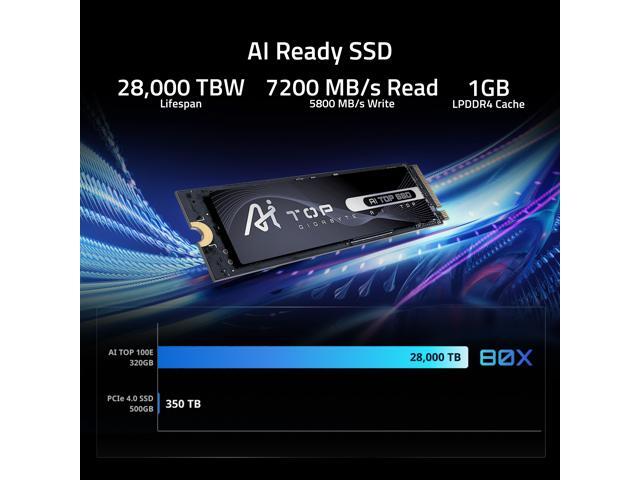 - AI Ready SSD: Designed exclusively for extensive data writing, the GIGABYTE AI TOP 100E SSD lasts 80x longer than standard SSDs - rated for an incredible 28,000 TBW.