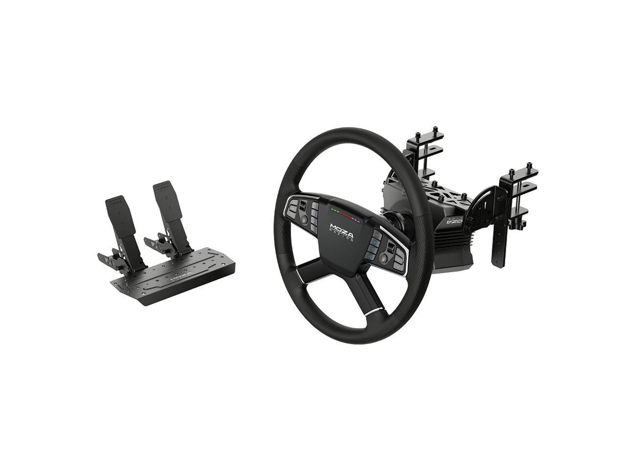 Includes the R5 Wheel Base for precise force feedback, the TSW Truck Wheel with customizable controls for enhanced realism, and the MOZA SR-P Lite Pedals for optimal performance