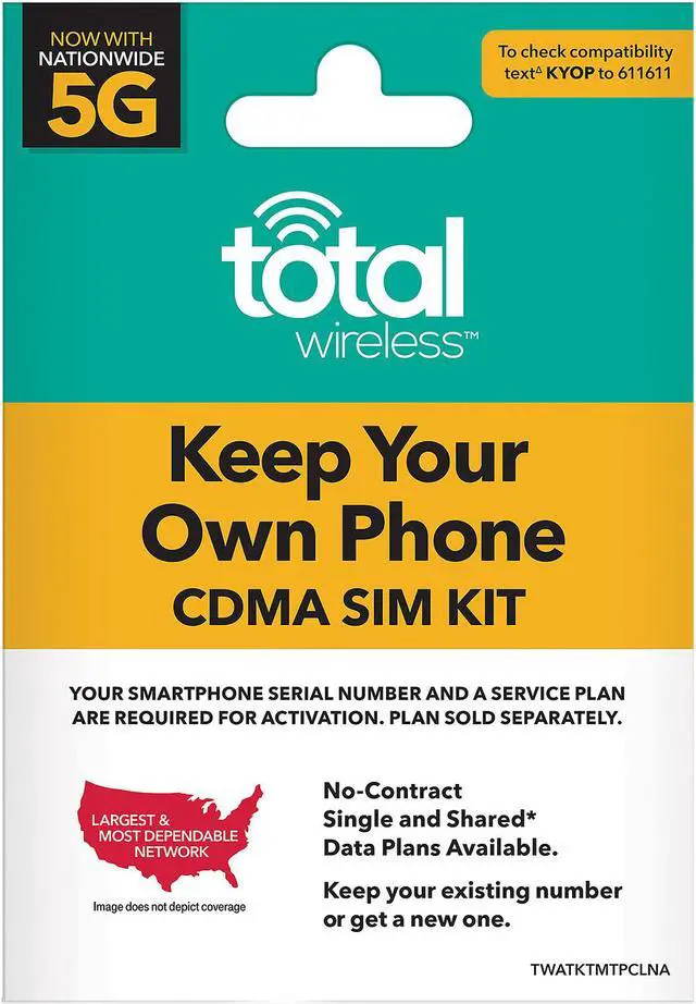 KIT INCLUDES: Universal SIM Card for you to activate your phone with Total Wireless. Compatible with CDMA phones with Micro, standard or Nano SIM cards. This item will not work on GSM based phones. COVERAGE: Stay connected, wherever. Get the Nationwide coverage you need on America's largest, most dependable 4G LTE network. WHY TOTAL WIRELESS: Get the Nationwide coverage you need on America's largest, most dependable 4G LTE network. A plan for you. A plan for everyone. Unlimited talk and text starts at just $25/line. BENEFITS: Keep your phone, network, and phone number. Compatible with most CDMA Smartphones such as Samsung Galaxy Series, HTC, LG, and all Apple iPhones. This item will not work on GSM based phones. |