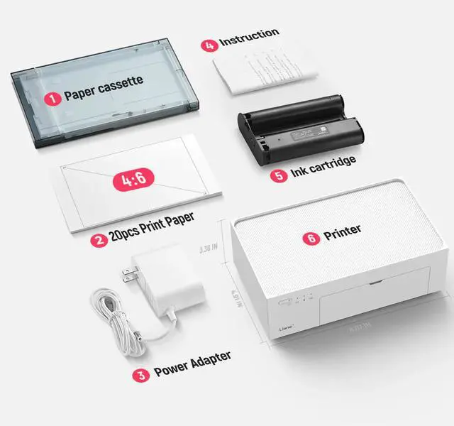 • Includes: 1 Printer + 20 Photo Papers + 1 cartridge.