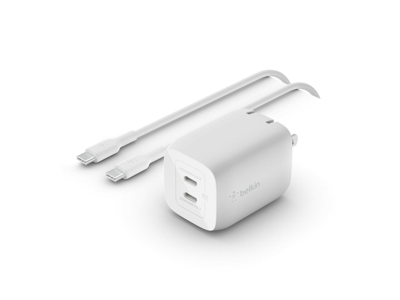 Belkin Dual USB-C GaN Wall Charger with PPS 65W + USB-C to USB-C Cable, White
