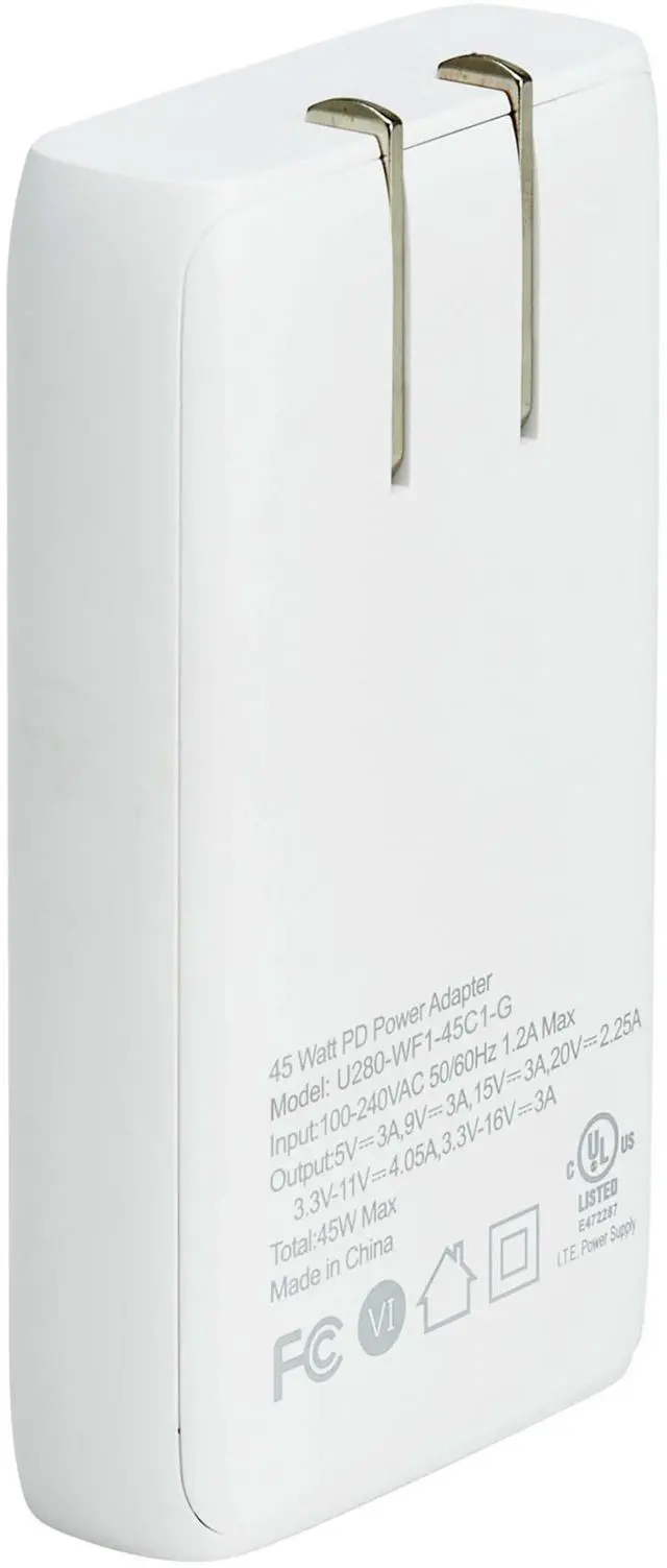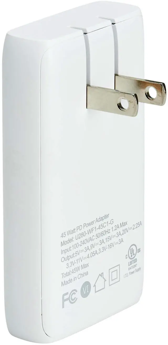USB Power Delivery (PD) 3.0 Input Connection Type: NEMA 1-15P Supports PD 3.0 charging up to 45W including 5V 3A, 9V 3A, 15V 3A, and 22V 2.25A. Supports PPS Charging at ranges of 3.3V-11V 4.05A and 3.3V-16V 3A.