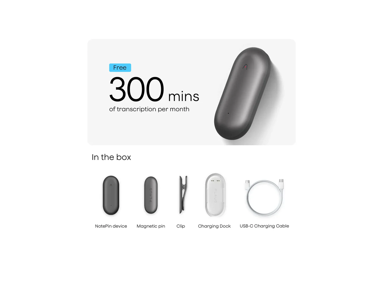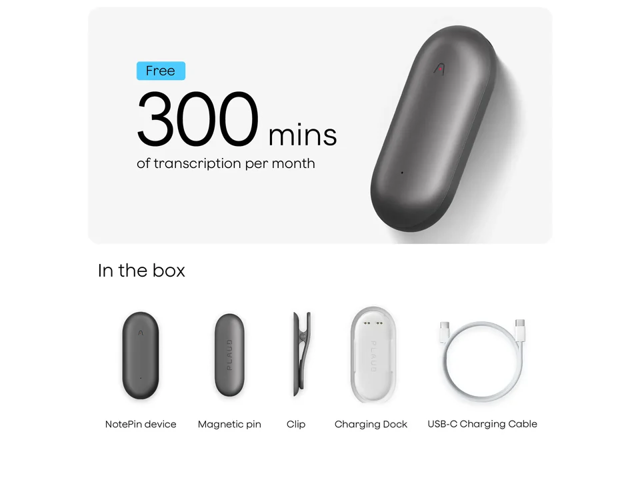 - Package Includes 1 x Plaud NotePin + 1 x Magnetic Pin & Clip + Unlimited Cloud Storage + Free Advanced AI Starter Plan